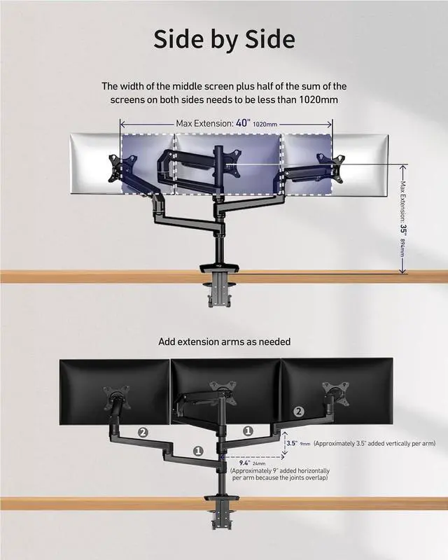 Since the long monitor arm offers swivel, tilt, and rotate adjustment, this 3 monitor stand can be retracted to the edge of the desk. Coupled with hidden cable management, a neat and functional workspace is always refreshing.