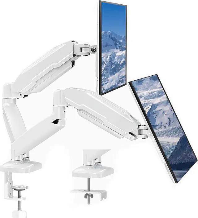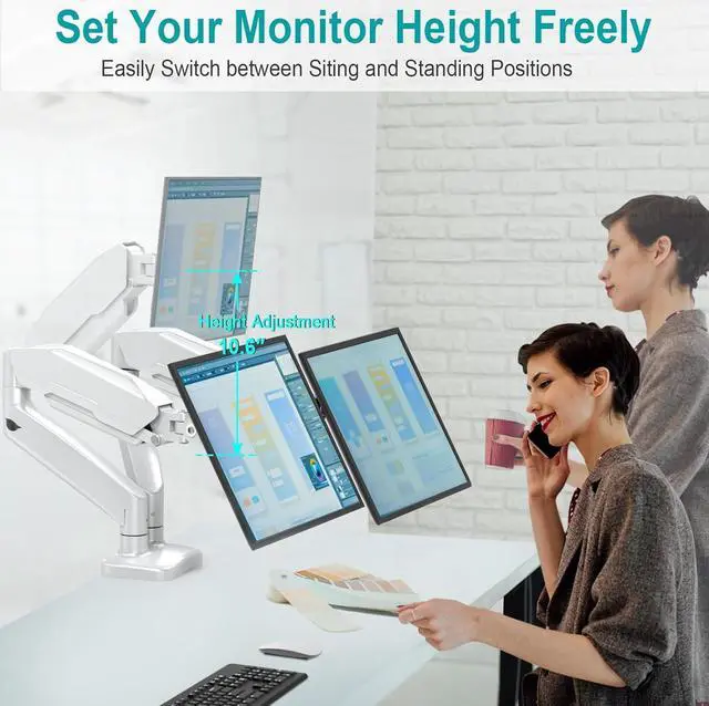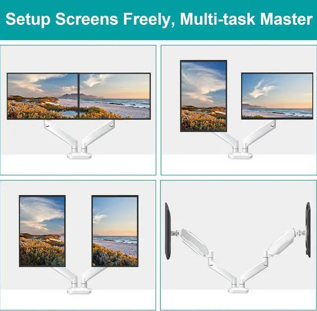 Discover The Most Productive Self - Have you felt inconvenient and ineffective while working with 2 screens? MOUNT PRO Gas Spring Dual Monitor Stand offers You A Perfect Solution! The full-motion construction of the dual monitor arms allows for smooth, effortless rotation and positioning in any direction. Better still, you can now work comfortably at your desk for long hours without stiff necks or back pain.