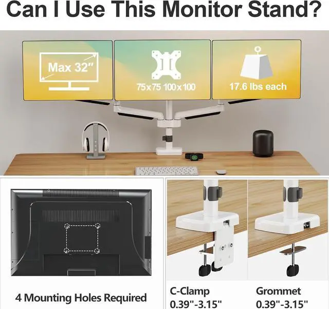 Assembly is a Simple Task - Our 3 arm monitor mount comes with labeled parts and clear instructions for quick assembly. Support C-clamp (desk thickness within 0.39 ''- 3.15 '') and grommet mount (desk thickness within 0.39 ''- 1.97 ''), choose the mounting method as your need