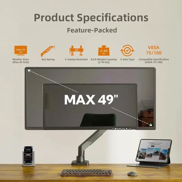 Monitor Arm is designed to fit most LCD/LED screens MAX 49", with a maximum load capacity of flat 44.4 lbs or curved 30.8 lbs. It supports standard VESA mounting patterns of 75x75mm and 100x100mm, ensuring compatibility with a wide range of monitors.