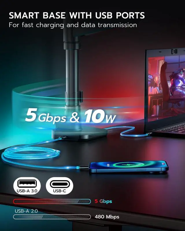 Convenient USB PortsThe dual monitor stand with enhanced USB functionality allows simultaneous charging of two devices. Integrated USB-C and USB-A ports (5V/2A) enable timely charging for your phone, watch, tablet, laptop, or headphones when battery levels are low, ensuring long-lasting peace of mind during use.