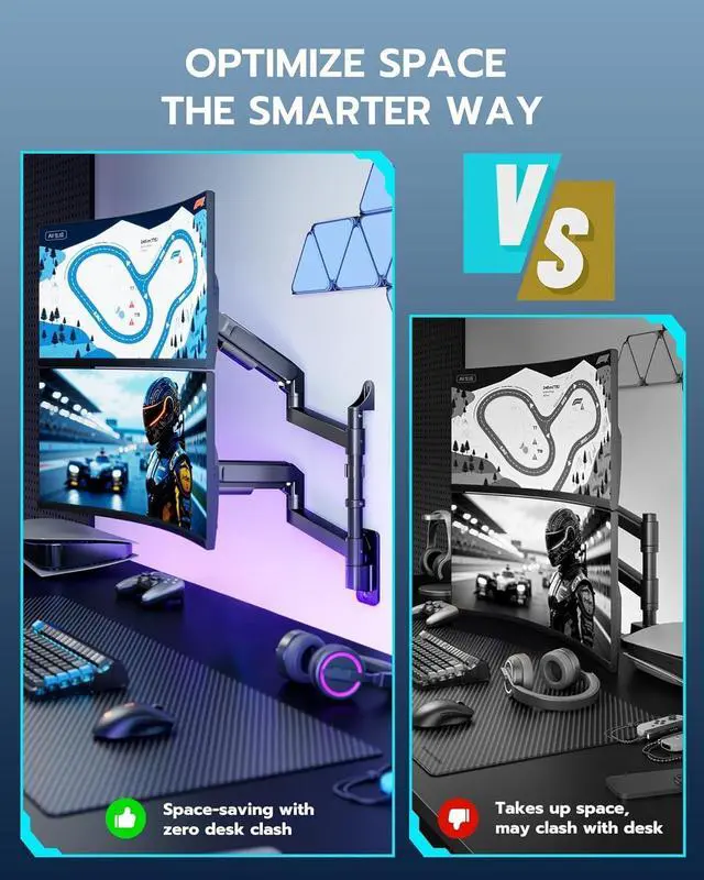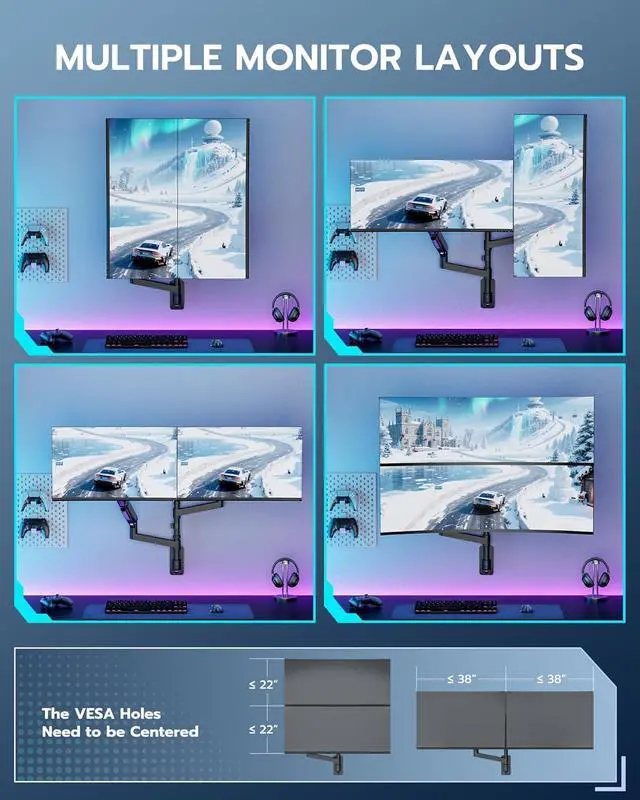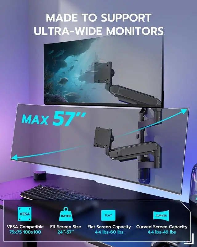 [Heavy Duty Dual Arm Support] This premium dual monitor arm wall mount is designed for ultrawide screens up to 57 inches, including curved gaming monitors. With a 60 lbs weight capacity per arm (22 kg for curved screens), it provides unmatched stability for dual-monitor gaming or productivity setups.