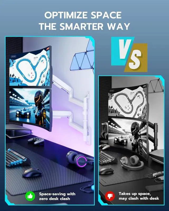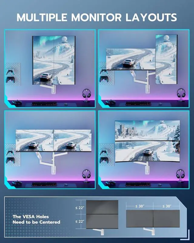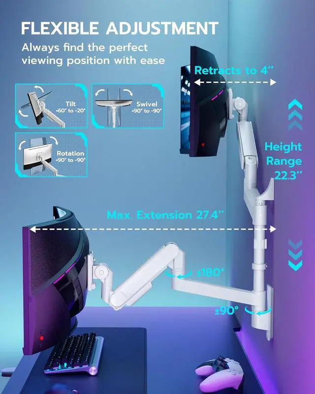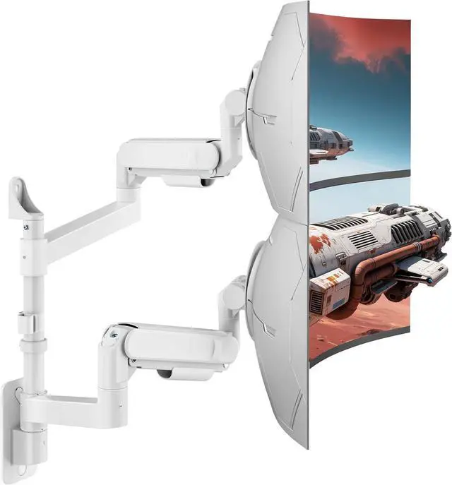 [Heavy Duty Dual Arm Support] This premium dual monitor arm wall mount is designed for ultrawide screens up to 57 inches, including curved gaming monitors. With a 60 lbs weight capacity per arm (22 kg for curved screens), it provides unmatched stability for dual-monitor gaming or productivity setups.