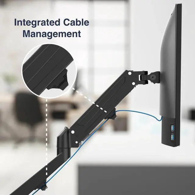 In-Built Cable ManagementKeeping your cables out of the way is crucial, to save accidents and to give your desk a professional appearance. Our Dual Gas Eco Monitor Arm has cable management built-in, allowing you to route your worse down the arm itself, and keeping them off of your desk, or from dangling below. Even better, there are no cables to snag when you want to adjust the position of your monitor - so you can move around as much as you like without the hassle of reorganising your cables.