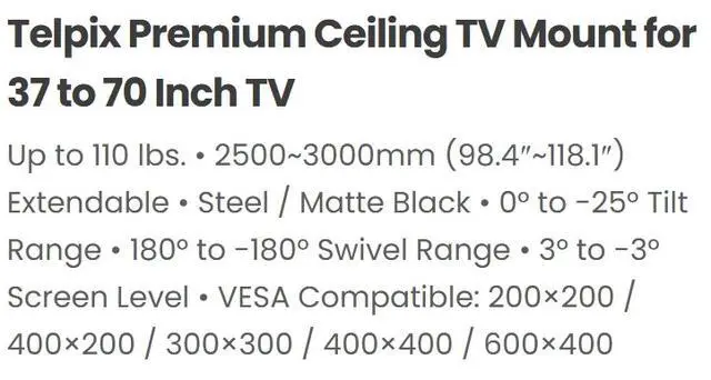 Up to 110 lbs. 2500~3000mm (98.4~118.1) Extendable Steel / Matte Black 0° to -25° Tilt Range 180° to -180° Swivel Range 3° to -3° Screen Level VESA Compatible: 200×200 / 400×200 / 300×300 / 400×400 / 600×400