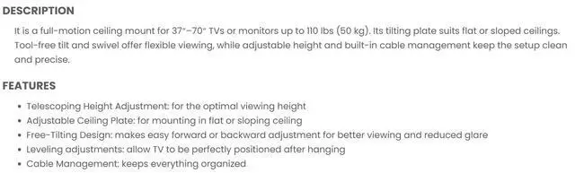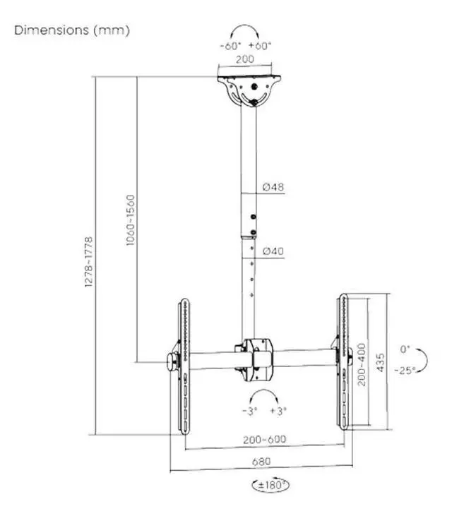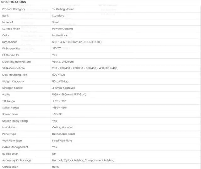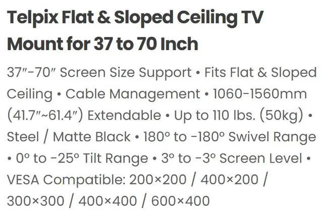 37-70 Screen Size Support Fits Flat & Sloped Ceiling Cable Management 1060-1560mm (41.7~61.4) Extendable Up to 110 lbs. (50kg) Steel / Matte Black 180° to -180° Swivel Range 0° to -25° Tilt Range 3° to -3° Screen Level VESA Compatible: 200×200 / 400×200 / 300×300 / 400×400 / 600×400