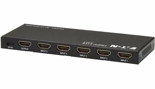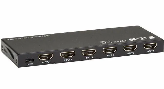 5-Port HDMI Switch with Remote Connects 5 Sources to One 8K HDMI DisplayThe B119-005-8K6 allows you to connect five separate HDMI audio/video sources to your 8K television, projector or monitor's HDMI input and switch between them. For instance, connect a media server, Blu-ray player, Xbox, laptop and PS4 Pro to your 8K HDTV, and use the manual push button or included remote control to switch from one input to another. Transmits 8K Video with