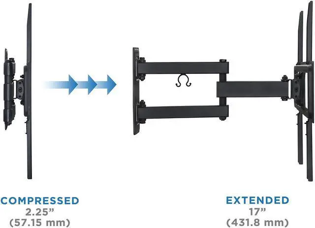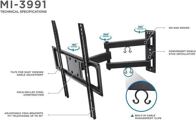 The MI-3991B wall mount is a heavy-duty steel mount that supports a variety of models and brands. The long extension arm, up to 17" from the wall, makes it ideal for corner installations. The arm also retracts to 2.5" for a low profile, space-saving design. Extend, retract, tilt or swivel to enjoy a comfortable view from any seat. Adjust the tilt to help reduce glare for a better viewing experience. Built-in cable management allows you to hide your cords with ease, and create a clutter-free environment.