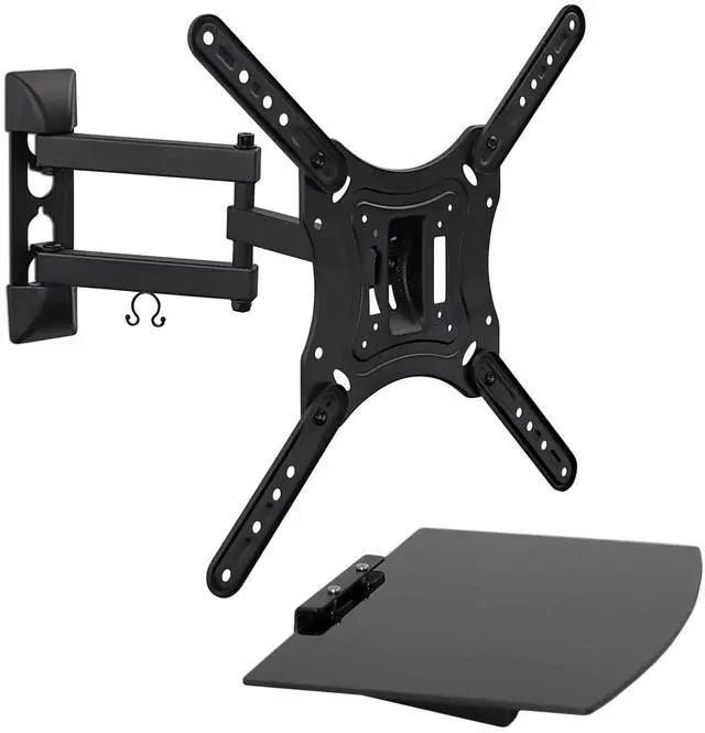 The MI-894 full motion TV wall mount is compatible with screens from 23" - 55". The tilt and swivel features will help you find the perfect viewing angle. Reduce glare and eye strain by tilting the screen. The included shelf conveniently holds your AV components within easy reach of your TV for an easier connection. This full motion TV mount allows for maximum viewing flexibility. Upgrade your entertainment center with this TV wall mount with shelf for a clean, sleek and minimalist look.