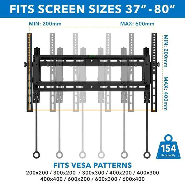 - Compatible with VESA patterns from 200mm x 200mm to 600mm x 400mm and screens up to 90"; holds up to 154 lbs.