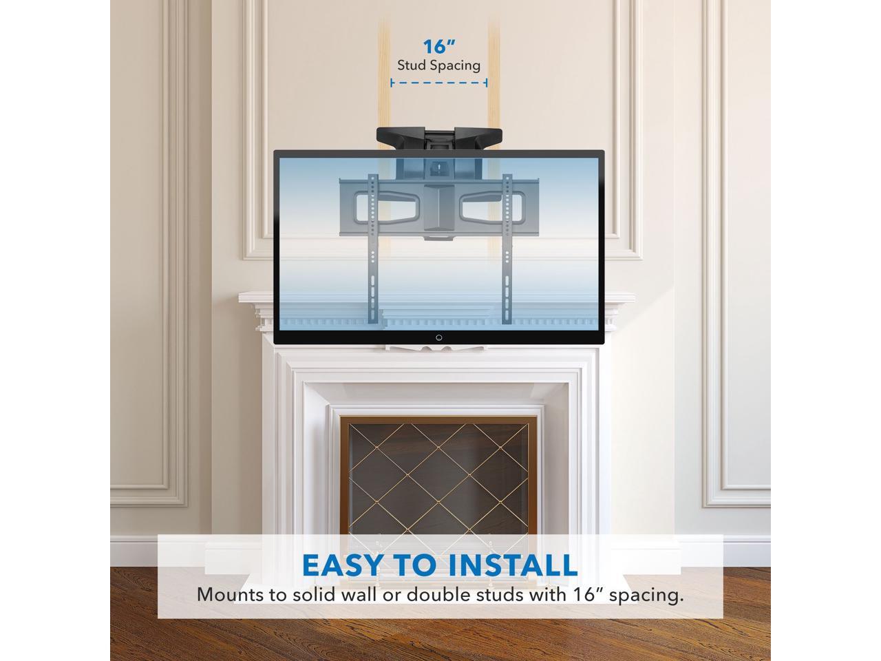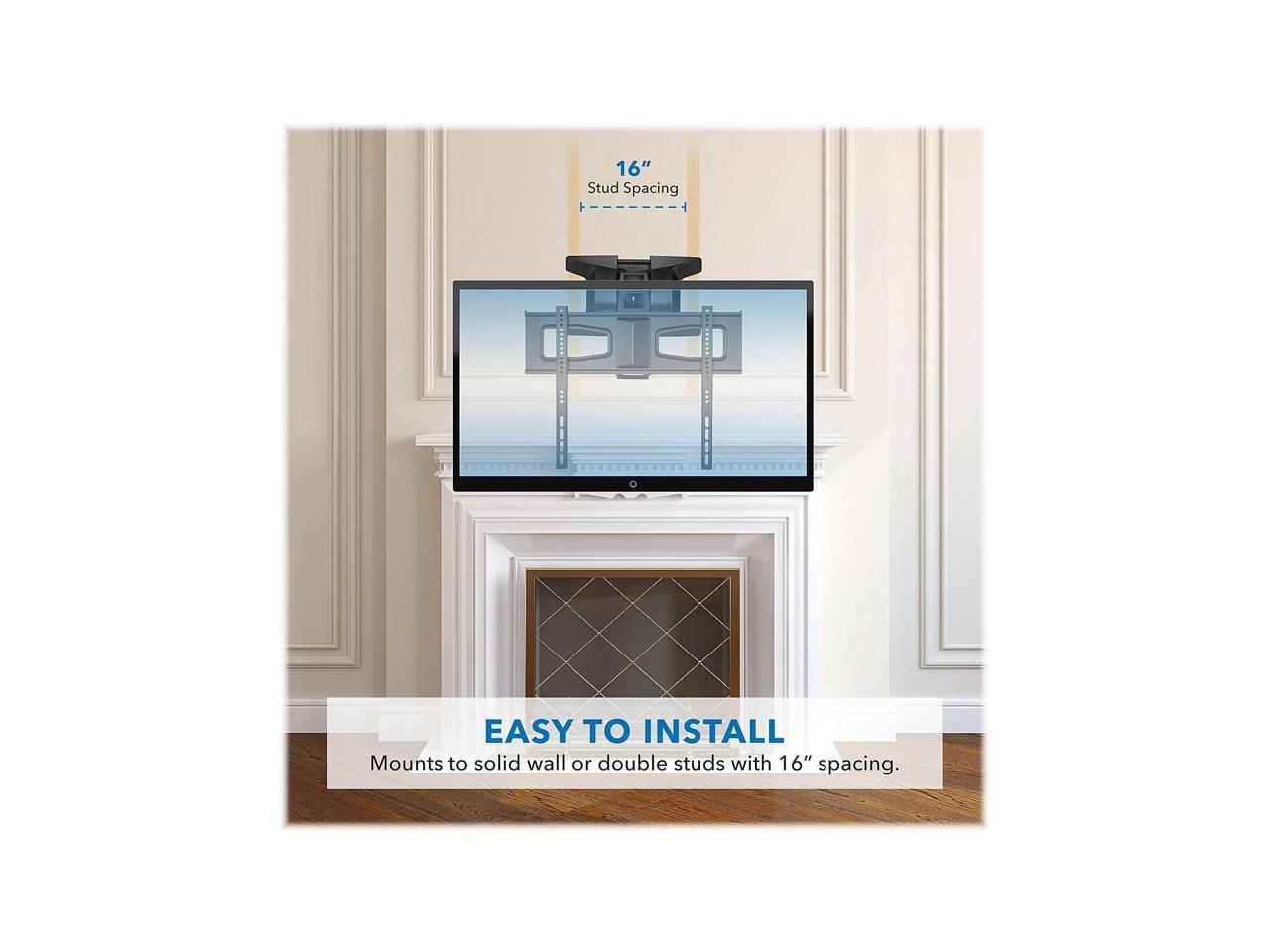 - Fireplace TV mount was designed to solve the typical problem of installing TVs above the fireplace. Large weight capacity makes this mount perfect for large-screen TVs. Neatly hide your cables behind your TV with cable clips. 1-year manufacturer limited warranty.