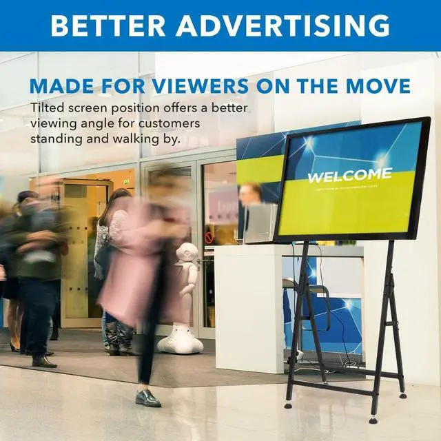 This TV stand is the perfect presentation solution for displaying dynamic, eye-catching graphics. Adjustable brackets let you mount your TV in portrait or landscape orientation. Tilted screen position offers a better viewing angle for customers walking by. The compact, folding design can fit in conferences, shows, museums, restaurants, and other environments.
