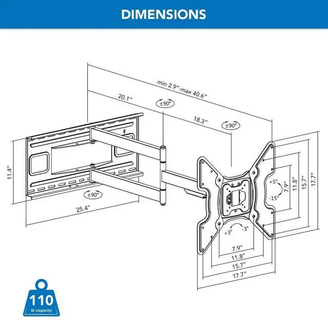 The Mount-It! 40" heavy-duty mount is one of the longest extending mounts. Made of heavy-duty steel with two support arms, this mount is designed to be one of the strongest possible brackets to support TVs weighing up to 110 pounds, so you know your TV is in safe hands. Tilt your screen down 15 degrees and swivel left or right at three pivot joints. Provides smooth adjustment for all directions, so you can choose the most comfortable and healthiest viewing angles. Full-motion movement makes this mount ideal for corner installation, inside an entertainment center, or anywhere you want.