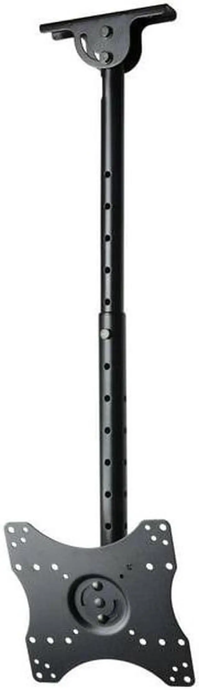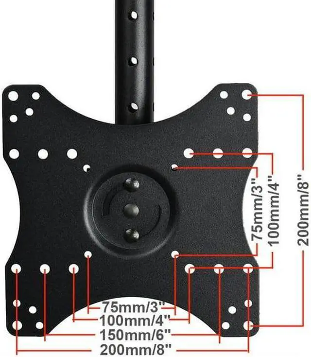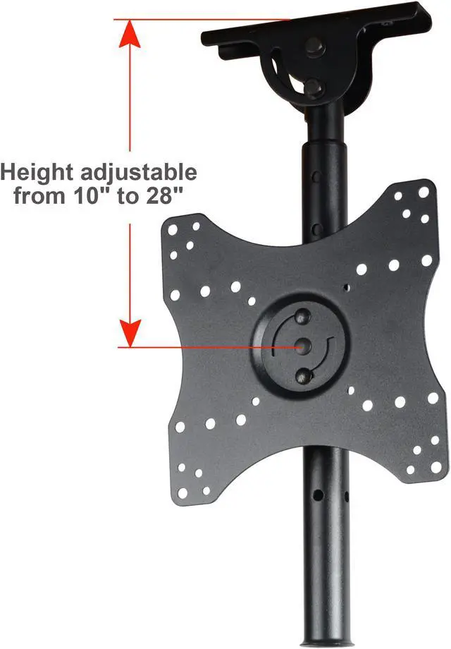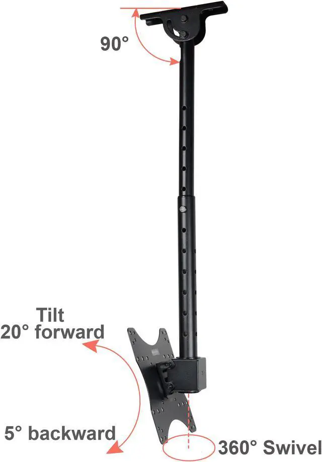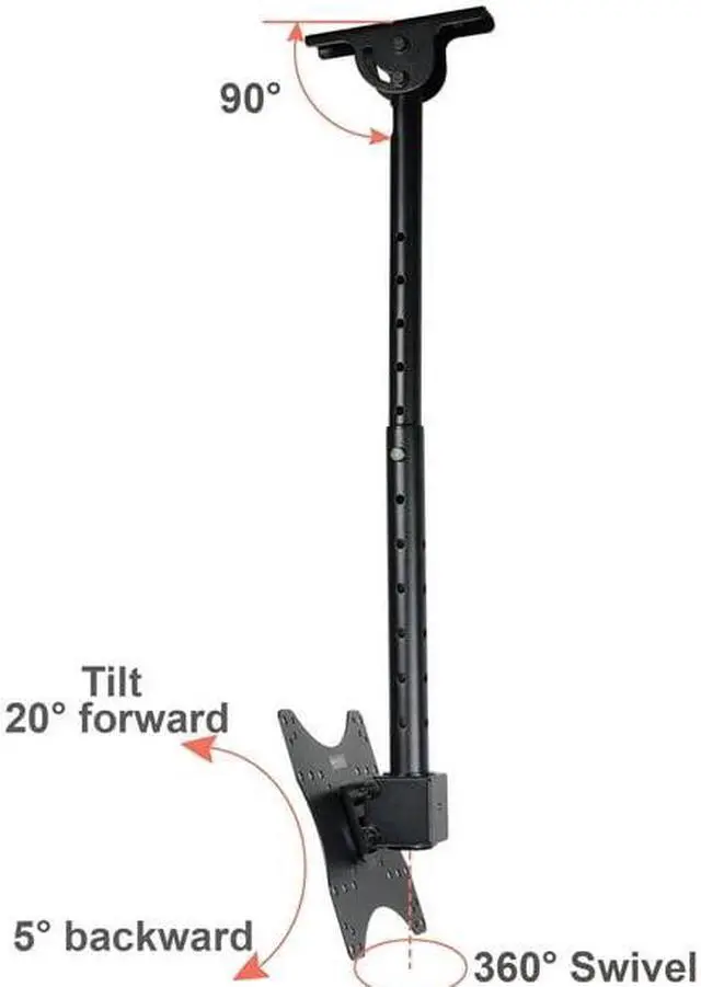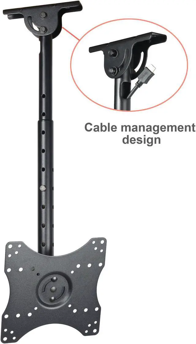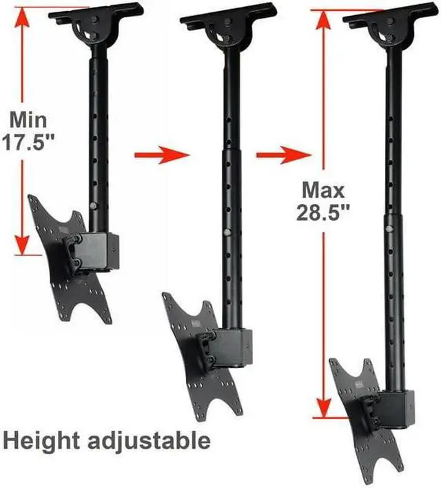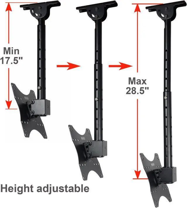 The ceiling mount fits most 27 - 43 inch TVs, some LED up to 47 inch TV (Please check VESA and weight). It supports maximum loading capacity up to 66 lbs (30kg) with VESA mounting hole patterns 75x75/ 100x100/ 200x100/ 200x200mm. This ceiling mount allows your TV or monitor to successfully adapt to any environment where a wall or desk mount is not an option. It provides optimum viewing positions with adjustable 20 degrees tilt up or down and up to 360 degrees of swivel. The TV plate center to ceiling adjustable from 10 inches to 28 inches by 1.5 inches. The pole height adjustable ranges of 17.5 - 28.5 inches from ceiling by 1.5 inches for optimal viewing height. Integrated cable management design can make the cable clutter to be hidden. The mount fits all kinds of ceiling, including vaulted ceiling.