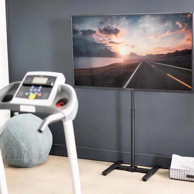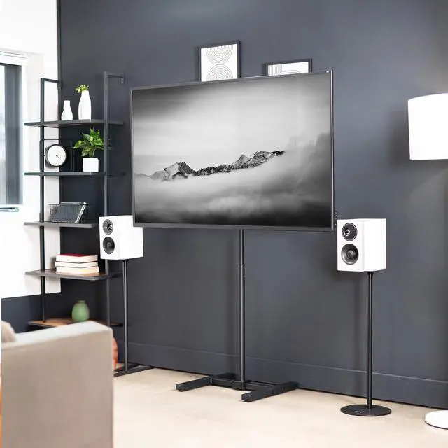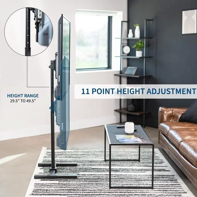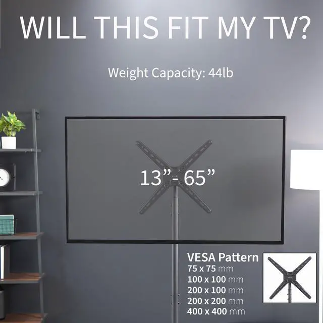 Enhance your visual display with the Black TV Stand (STAND-TV08) from VIVO! This sturdy TV stand holds the majority of flat and curved screens from 13 to 65 in size and has a weight capacity of 44 lbs. Features include telescoping height adjustment, 30-degree screen tilt, and leveling feet. This television stand provides the perfect setup for both home and professional use whether youre gaming on an Xbox in your dorm room, giving a work presentation at the office, or teaching in a classroom. Popular Compatible Screen Sizes (Not Comprehensive): 13, 19, 24, 27, 32, 37, 40, 42, 43, 48, 49, 50, 65"Screen Types: Holds most LCD, LED, OLED, 4K, Smart, Outdoor, Flat, and Curved TVs