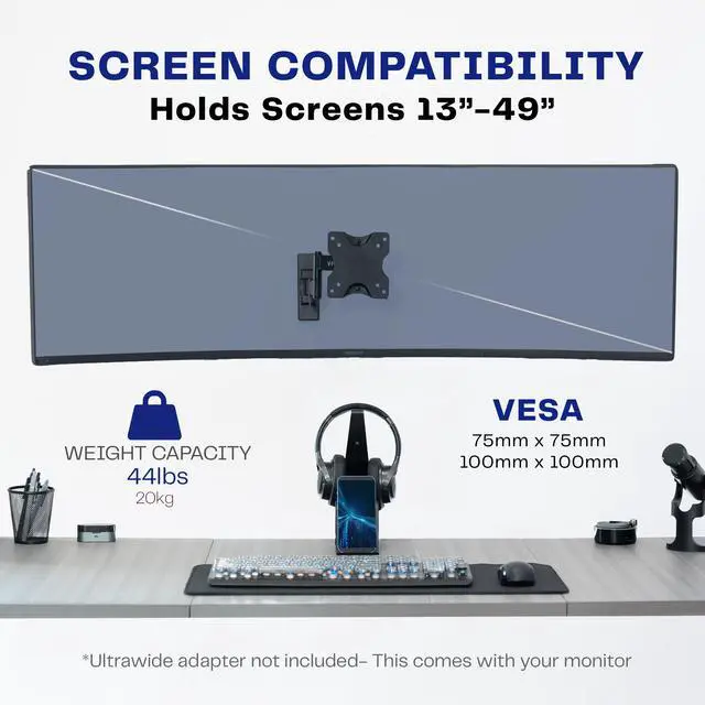 Create optimal viewing angles and space efficiency with MOUNT-VW01M from VIVO! This fully articulating ultrawide monitor wall mount features simple assembly and fluid movement for easy screen positioning. The high-grade steel construction allows a weight capacity of 44 pounds and holds ultra-wide monitors up to 49". Featuring screen tilt for a glare-free presentation, swivel for the best possible viewing angles, and a cable management system that holds power and video cords, this mount was built to perform! It collapses flat against the wall for a low profile, and when fully extended, sits 10.5" from the wall.