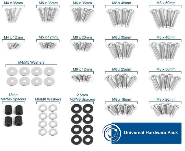 M4 x 12mm Bolt - (4pcs)M4 x 35mm Bolt - (4pcs)M5 x 12mm Bolt - (4pcs)M5 x 35mm Bolt - (4pcs)M6 x 12mm Bolt - (4pcs)M6 x 20mm Bolt - (4pcs)M6 x 35mm Bolt - (4pcs)M8 x 16mm Bolt - (4pcs)M8 x 20mm Bolt - (4pcs)M8 x 25mm Bolt - (4pcs)M8 x 30mm Bolt - (4pcs)M8 x 35mm Bolt - (4pcs)M8 x 40mm Bolt - (4pcs)M8 x 45mm Bolt - (4pcs)M8 x 50mm Bolt - (4pcs)M4/M5 Washer - (8pcs)M6/M8 Washer - (8pcs)2.5mm M6/M8 Spacer - (8pcs)12mm M4/M5 Spacer - (4pcs)