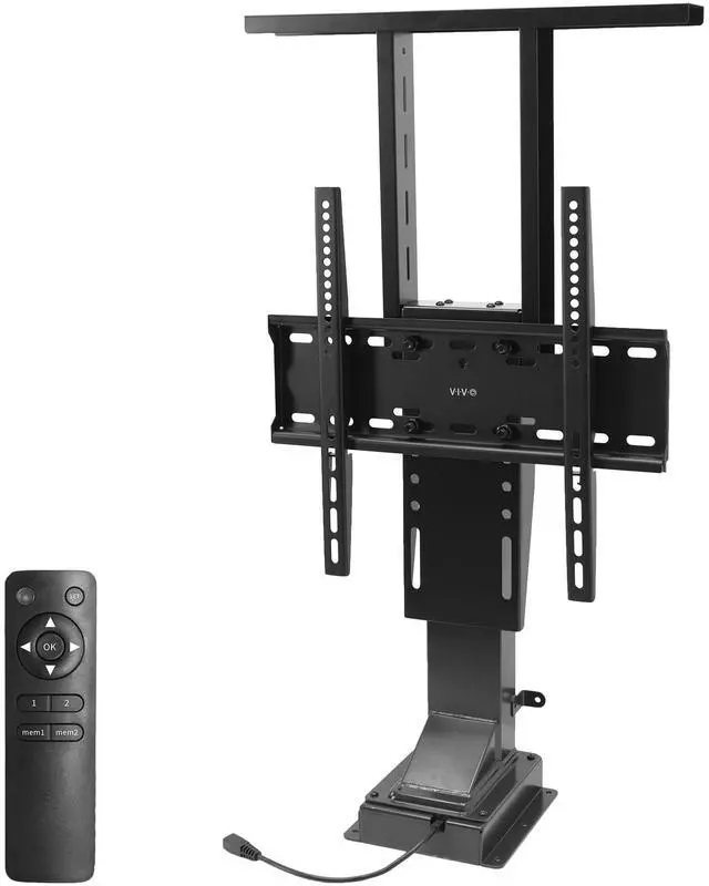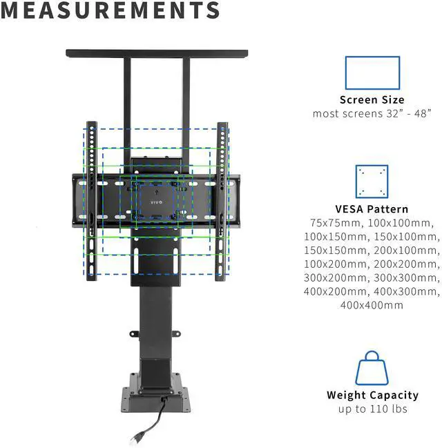 Mounting and adjusting your TV screen is smoother and simpler than ever with the Compact Motorized TV Lift Stand from VIVO! Instead of straining your neck, back, and eyes trying to find the perfectly comfortable angle for your viewing experience, do it with the press of a button. This mount is remote controlled with motorized height adjustment. And when you're not using the TV, take advantage of the compact design which makes it easy to conceal. The aluminum and steel construction is elegant, durable, and blends in with almost any environment. It can support TV screens anywhere from 32" to 48" in size and 110 lbs in weight. The variable mount placement and holes within the column make it compatible with VESA layouts from 75x75mm to 400x400mm. Please Note: This stand is not for ceiling mounting. All the necessary instructions and hardware are provided to get your stand assembled and TV mounted in no time!
