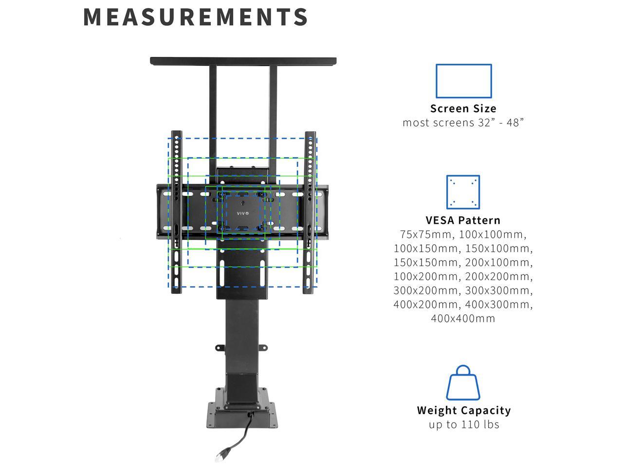 Fits 32" to 48" Screens: Designed to support a 32" to 48" TV weighing up to 110 lbs, this motorized lift is meant to be installed inside of a cabinet for maximum stability. It does not have a freestanding base design