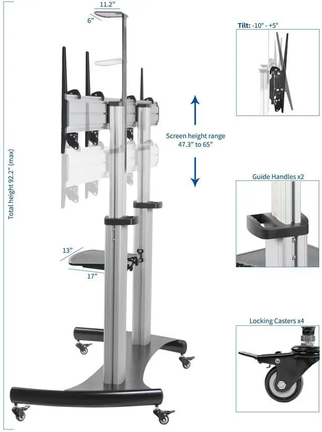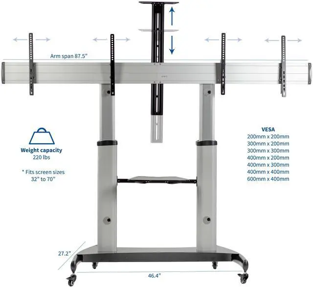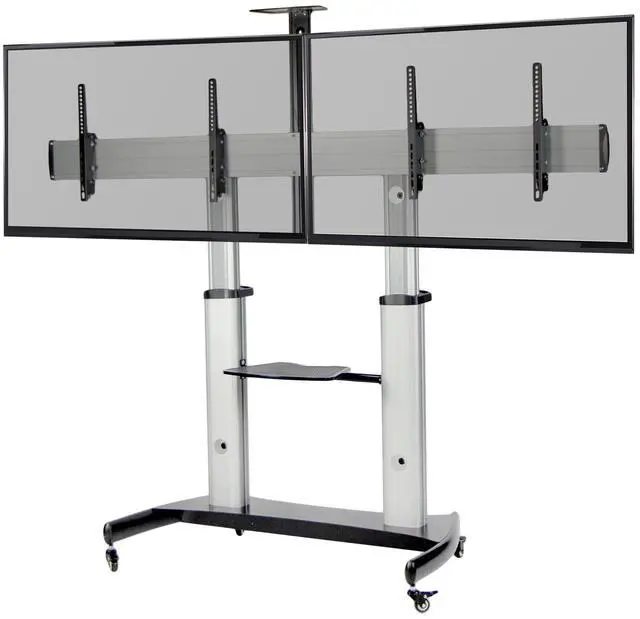 Take your double-screen display on the go with the Silver Mobile Dual TV Cart (STAND-TV12H) from VIVO! This sturdy portable 2 TV mount holds the majority of flat and curved screens from 32 to 70 in size and has a weight capacity of 220 lbs total. Features include telescoping height adjustment, +5° to -10° screen tilt, 2 media shelves, dual columns, and locking wheels. This television stand provides the perfect setup for both home and professional use whether youre gaming on your Xbox, giving a work presentation at the office, or teaching in a classroom.Popular Compatible Screen Sizes (Not Comprehensive): 32, 37, 40, 42, 43, 48, 49, 50, 55, 60, 65, 70Screen Types: Holds most LCD, LED, OLED, 4K, Smart, Outdoor, Flat, and Curved TVs