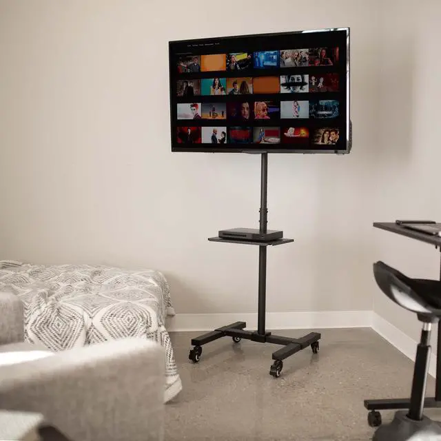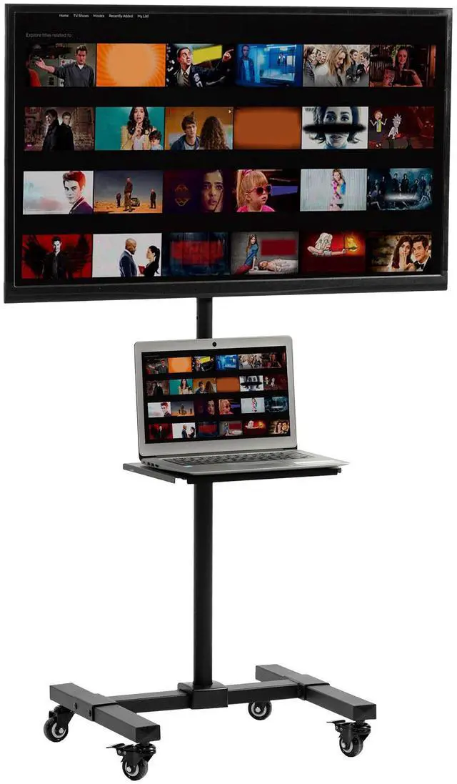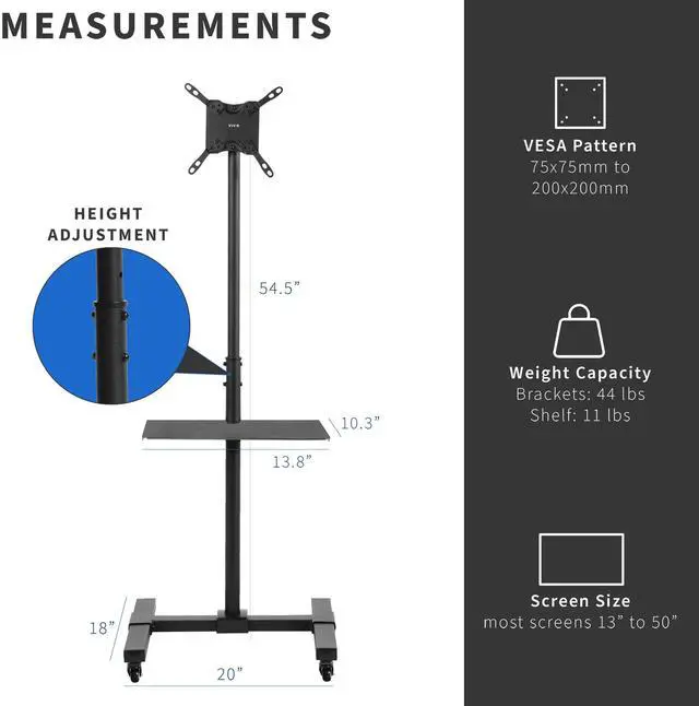 Enhance your visual display with the Black Mobile TV Cart with Storage Shelf (STAND-TV07W-S) from VIVO! This sturdy portable TV mount holds the majority of flat and curved screens from 13 to 50 in size and has a weight capacity of 44 lbs. Features include telescoping height adjustment, 30-degree screen tilt, and locking wheels. This television stand provides the perfect setup for both home and professional use whether youre gaming on an Xbox in your dorm room, giving a work presentation at the office, or teaching in a classroom.Popular Compatible Screen Sizes (Not Comprehensive): 13, 19, 24, 27, 32, 37, 40, 42, 43, 48, 49, 50Screen Types: Holds most LCD, LED, OLED, 4K, Smart, Outdoor, Flat, and Curved TVs
