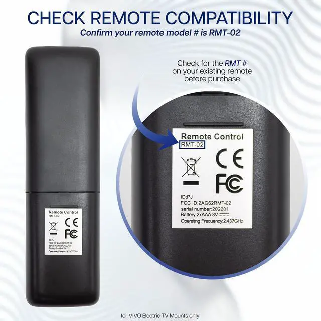 Spare RF remote control (PT-RT-70) from VIVO. Fits our electric TV mounts; MOUNT-E-FD70, MOUNT-E-MM070, MOUNT-E-UP44, MOUNT-E-UP65A, and MOUNT-E-WM075.