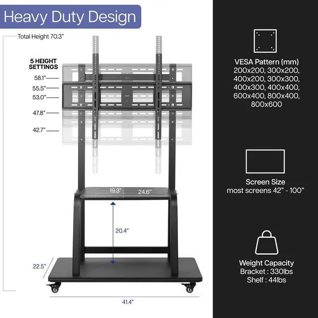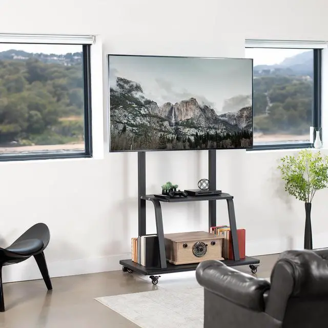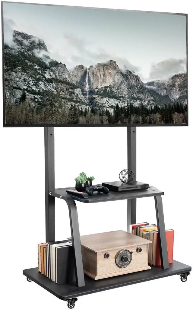 Add mobility to your oversized TV with the Black Heavy Duty Mobile TV Cart (STAND-TV100C) from VIVO! With an all-steel frame supporting up to 330 lbs, this rolling stand fits ultra-large TVs up to 100 in size. The commercial-grade casters were designed for smooth mobility on a variety of surfaces, easily transporting heavy TVs. Built-in locking mechanisms on each caster securely hold the cart in place when needed for added safety. The raised accessory shelf is perfect for speakers, laptops, streaming devices, and AV equipment for an all-in-one solution. For additional storage capacity, the solid steel base doubles as a platform for larger items. This television stand provides the perfect setup for both home and professional use whether youre gaming on your Xbox, giving a work presentation at the office, or teaching in a classroom. All hardware and instructions are provided for hassle-free assembly.