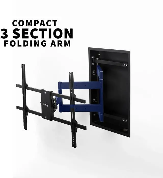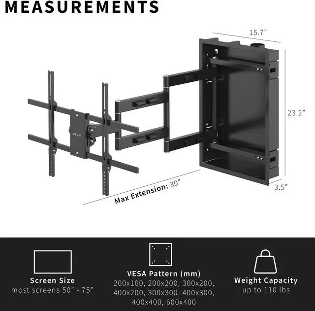 Display your TV as a flush-to-wall, floating screen setup with the Recessed TV Wall Mount (MOUNT-REC01) from VIVO! The in-wall design offers the convenience of an extending, articulating arm with the clean look of zero-gap mounting. When the arm is folded, cables are completely hidden to create a picturing-hanging style TV display. Extending a total of 30 from the wall, the arm creates comfortable viewing angles for the whole group to enjoy. The mounting bracket fits 50 to 75 flat are curved screens alike with VESA patterns from 200x100mm to 600x400mm. Solid steel design holds up to 110 lbs with ease, providing a secure hold for your large TV.