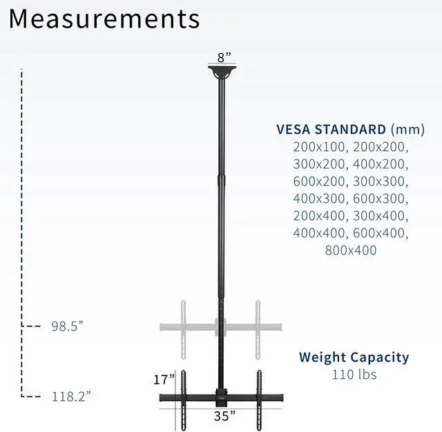Find just the right mounting solution for your vaulted ceilings with the Large TV Ceiling Mount with 10ft Pole (MOUNT-VC90-10) from VIVO! This durable product is compatible with most 37 to 90 TV's on the market (VESA patterns up to 800x400mm), making it ideal for both commercial and residential use. Strength-tested to support screens weighing up to 110 lbs, it will keep your valuable equipment safe and secure. The mount features tilt for glare reduction and full 360-degree swivel for flexible positioning. Telescoping height adjustment places your TV 98.5 to 118.2 from the ceiling surface. All hardware and step-by-step instructions are provided for assembly and installation so you can enjoy your new TV mount in no time!