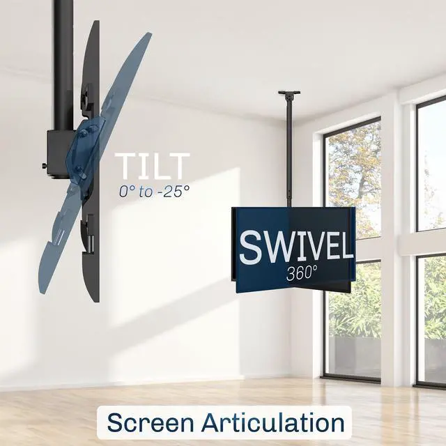 Find just the right mounting solution for your vaulted ceilings with the TV Ceiling Mount with 5.5ft Pole (MOUNT-VC86-5) from VIVO! This durable product is compatible with most 43 to 86 TV's on the market (VESA patterns up to 600x400mm), making it ideal for both commercial and residential use. Strength tested to support up to 132 lbs, it will keep your large screen safe and secure. The ceiling brackets tilting mechanism is compatible with both flat and sloped/vaulted ceilings, and screen articulation is provided for flexible positioning. Telescoping height adjustment places your TV 43.1 to 66.7 from the ceiling surface. All hardware and step-by-step instructions are provided for assembly and installation so you can enjoy your new TV mount in no time!