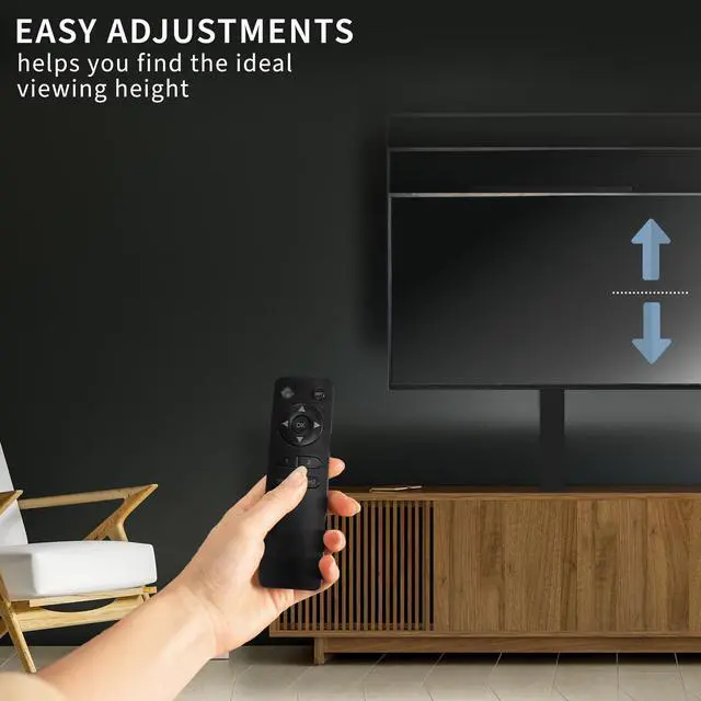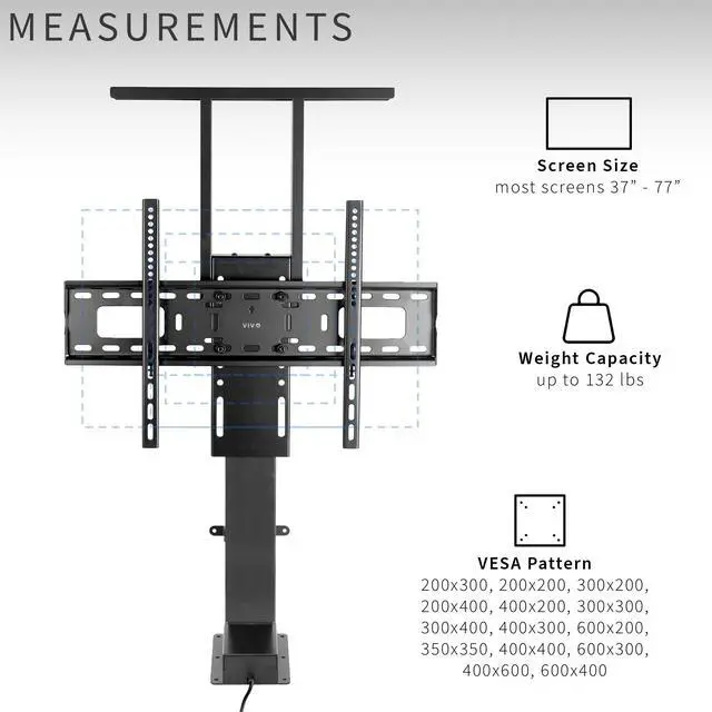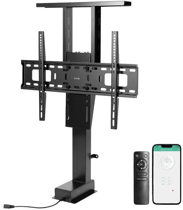 Mounting and adjusting your TV screen is smoother and simpler than ever with the Motorized TV Stand with Remote Control (MOUNT-E-UP80P) from VIVO! Instead of straining your neck, back, and eyes trying to find the perfect angle for your viewing experience, do it at the press of a button. This mount is remote-controlled with motorized height adjustment, and you can also connect the Tuya app to access convenient controls right from your mobile device! When youre not using the TV, take advantage of the compact design that makes it easy to conceal. The variable mount placement and holes within the column make it compatible with VESA layouts from 200x200mm to 400x600mm. All the instructions and hardware are provided to get your stand assembled and TV mounted in no time!
