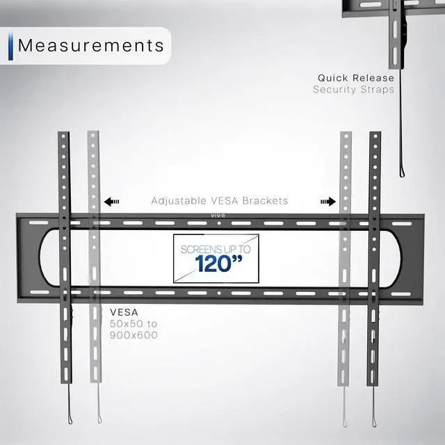 Enhance your viewing experience with the Heavy Duty Extra Large TV Wall Mount (MOUNT-VW120F) from VIVO! Supporting 60 to 120 screens weighing up to 264 lbs with 50x50mm to 900x600mm VESA hole patterns, this mount was built to perform. Features include solid steel construction for strength and durability, open architecture for superior ventilation and easy access to wiring, and click-in spring locks with simple release cords for screen mounting and removal. The sleek bracket holds your TV just 1.4" from the wall for a low-profile appearance and is perfect for any home theater or business environment. Assembly is an easy process, and we provide all the hardware to get your screen properly mounted in no time!