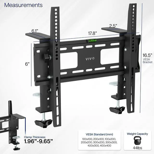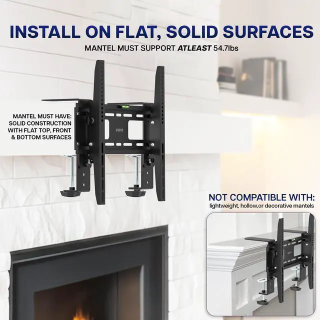 Enhance your viewing experience without drilling into the wall with theKEY_TAB Mantel TV Mount (MOUNT-M50C) from VIVO! This clamp-on mount offers a sturdy, drill-free solution for installing your TV directly above your fireplace. Perfect for more temporary solutions like apartments, renting situations, or anyone looking for a clean setup without permanent installation. Reinforced steel design holds 32" to 50" screens weighing up to 44 lbs, and protective padding keeps your mantel in pristine condition.