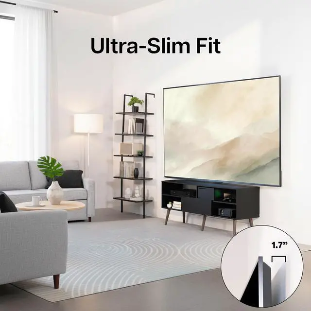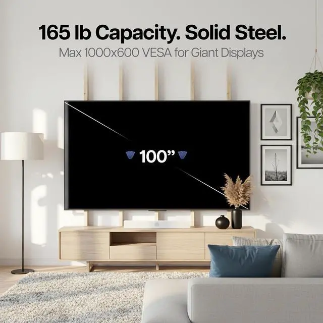 Enhance your viewing experience with the No Stud TV Wall Mount (MOUNT-NS100) from VIVO! Supporting 32 to 100 screens weighing up to 165 lbs with 150x100 to 1000x600mm VESA hole patterns, this mount was built to perform. Now you can hang your TV exactly where you want it without being limited by offset studs. This no-drill mount works beautifully with drywall using picture hanging style installation that includes numerous drywall nails. It also features solid steel construction for strength and durability and open architecture for superior ventilation. The sleek bracket holds your TV just 1.7" from the wall for a low-profile appearance that's perfect for any home or office environment.
