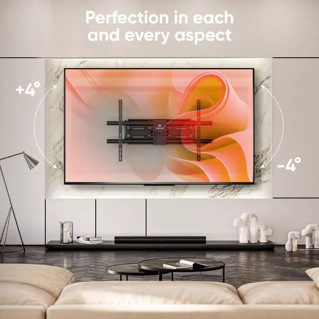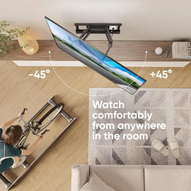 Multiple adjustment options of the large TV wall mount full motion allow you to use your screen comfortably. With adjustable outreach of the long arm TV mount wall, you can position the screen either up against the wall or extend the full motion wall mount TV out.