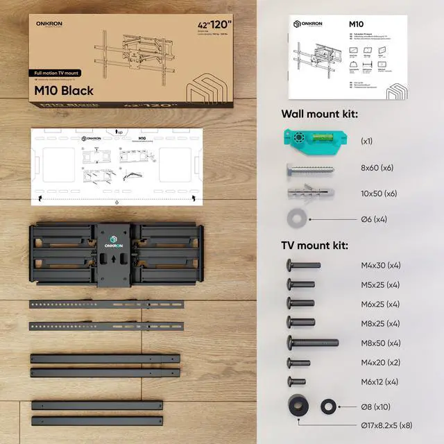 Extendable TV mount with arm is made of high-quality steel. With its trendy design, this large TV mount swing arm can blend in with any interior. Decorative overlays will hide the television wall mount screws. Extendable TV wall mount comes with a removable spirit level, drilling template, and a set of mounting hardware.