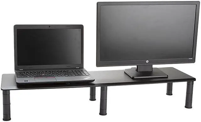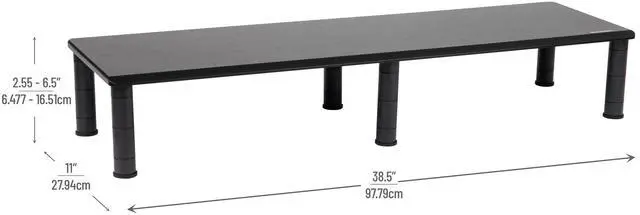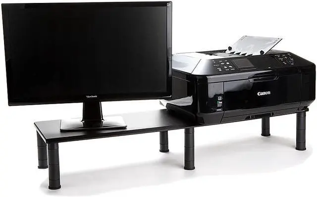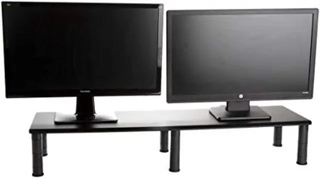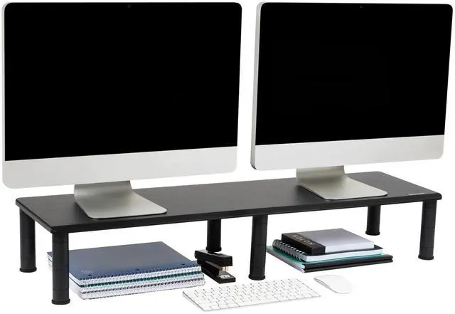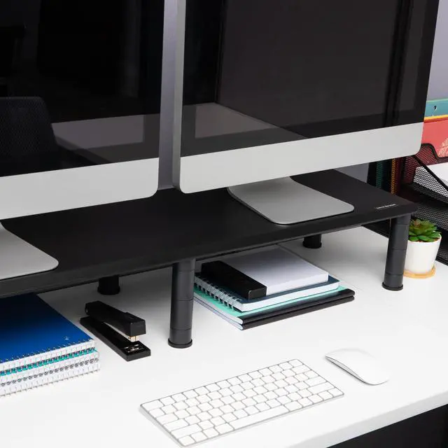 mind reader dubmo-blk large dual stand for computer screens, riser support the heaviest monitors, printers, laptops, tv's, perfect shelf organizer for office desk accessories, height adjustable, black"Dual Monitor StandThe Mind Reader Dual Monitor Stand easily supports your heaviest monitor (s), all in one computer/iMac, printers, speakers and more. It also works with all types of media devices. Optimal Viewing4 adjustable heights for your preferred viewing needs. The smallest height is 3.25"" inches off the surface, after that you can raise up to 4.5"" inches, 5.25"" inches and finally a max height of 6.5"" inches from the surface.