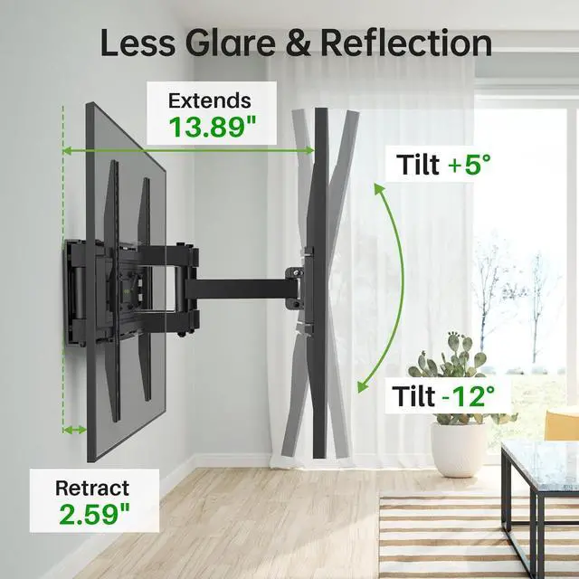 Your Viewing: This swivel TV mount tilts -12°/+5°to reduce glare and swivels the TV left or right according to your seat position for the best viewing angle. The full motion TV wall mount with dual articulating arms provides a smooth 13.89 extension and retract back to 2.59 making your TV alive to moveSturdy and