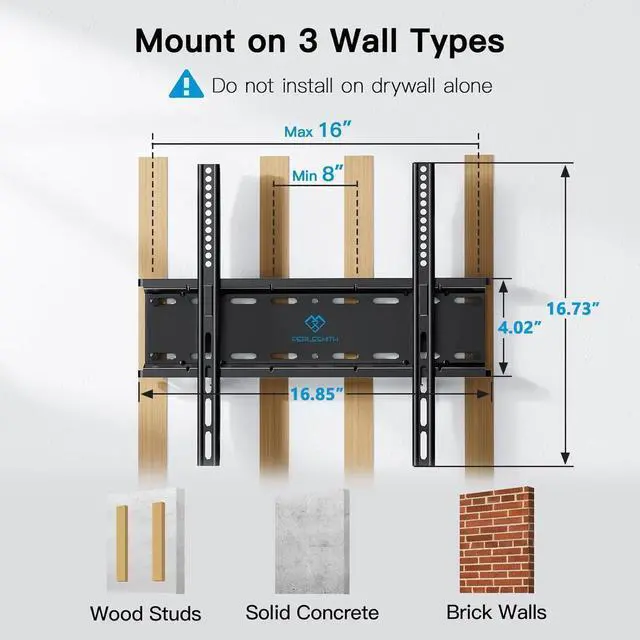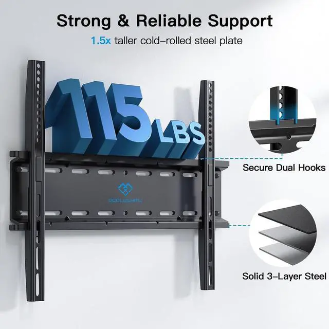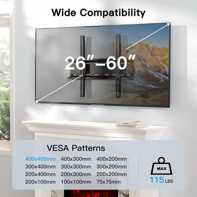 UNIVERSAL COMPATIBILITY This TV mount fits most 26-60 Inch TVs on the market today VESA is compatible with 75x75mm 100X100mm 200X100mm 200X200mm 300X200mm 300X300mm 400X 200mm 400X300mm 400X400mm. If your wood stud spacing exceeds 16 inches please refer to the 16 18 24 wood stud full motion TV mount PSLLK1. DURABLE AND RELIABLE Our mount comes safety screws at the bottom of TV brackets that are designed to prevent your TV from moving Built with durable sturdy stainless steel this TV holder is designed to support a TV weight up to 115 lbsSAVE SPACE Our low-profile wall mount allows your TV to sit just 1.18 from the wall therefore saving you a lot of space The sleek modern appearance adds to your home or office decor and will look great in any roomEASY INSTALLATION Have your TV mounted onto the wall within 15 minutes with our simple 3-step installation process Our television bracket comes with an easy-to-follow installation guide and all the required screws and hardware10 YEAR SERVICE All our products are made of the highest quality materials so we are very confident that our TV mount will fit your needs All mounts are backed by our 10 year manufacturers service If you have any questions please feel free to contact us at anytime