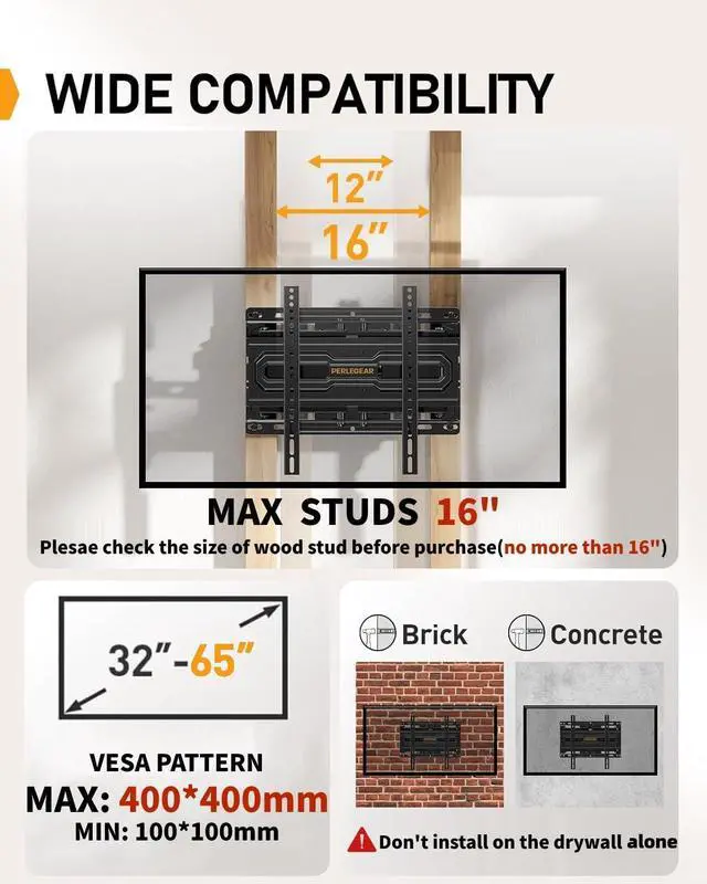Wide Compatibility: The TV wall mount is compatible with most flat or curved 32-65 TVs up to 99 lbs with VESA mounting patterns 100x100 to 400x400mm. The TV mount can be installed on 12 or 16 wood studs concrete or brick walls. If your wood stud spacing exceeds 16 inches please refer to the 16 18 24 wood stud full motion TV mount PGLF16.