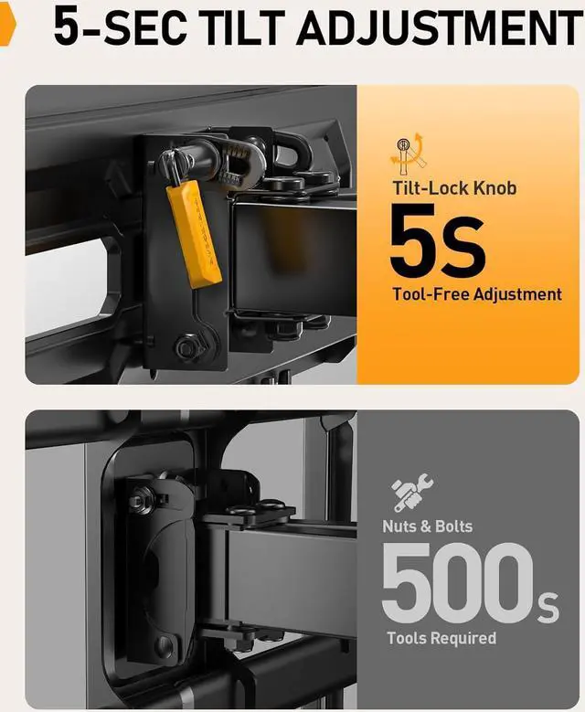 Full Motion Features: The TV mount is designed with tool-free tilt to adjust your screen 5° up or 15° down for less screen glare. The adjustable TV wall mount also offers +/-45° swivel to direct the TV toward your viewing position and 17.3 extension for a more immersive viewing experience.