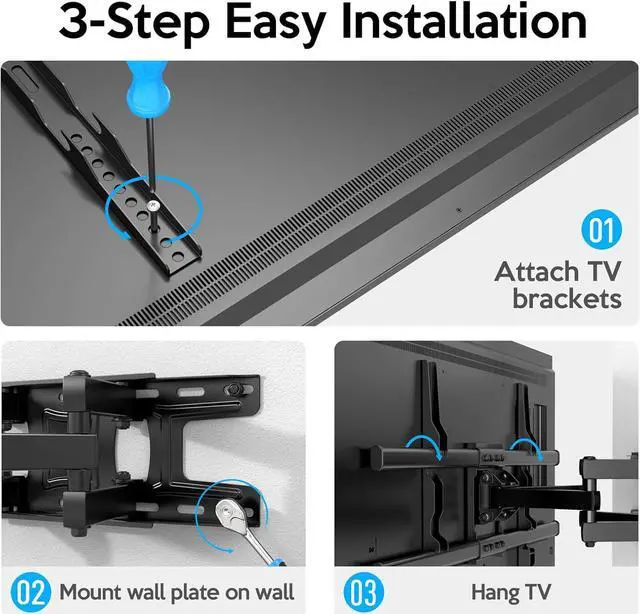 UNIVERSAL TV WALL MOUNT-Full motion TV wall mount for most 37-75 Inch Flat Curved TVs up to 110LBS fits VESA 200X100mm (8x4) to 600X400mm (24x16). FLEXIBILITY TV MOUNT-Wall mount TV bracket tilts down 12° and Tilt backward 6° to reduce glare and protect eyes. Swivel left or right 45° to get better viewing angle. Extends long to 14.7 to convenient operation back of TVs. Retract back to 2.4 from the wall to save space. EASY INSTALLATION-Easy to install it in 3 step less than 15 min. +/-3° Level adjustment allows adjust TVs to keep level without dismantling and reinstalling.