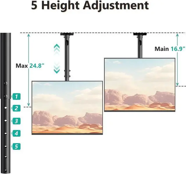 ADJUSTMENT: TV ceiling mount can be tilted down 25° Left-right swivel range of 360° Rotate both ways 3°. 2 Incremental Height Adjustment of 16.89 to 24.76 from ceiling to center of mounting plate for the wonderful viewing angles creating a more open and organized living or working environment.