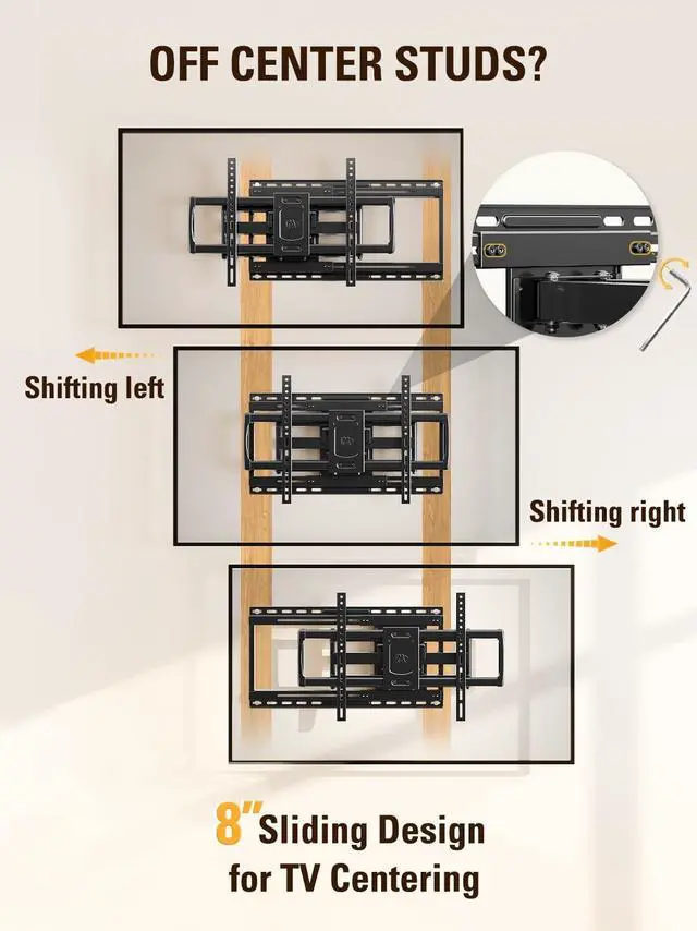 Perfect centered design: Off Center Studs? Full Motion TV Wall Mount with 8 sliding design allows TV shifting left or right it is easy for TV centering on the wall plate. All our TV mount can not be installed on drywall alone. TV Mount