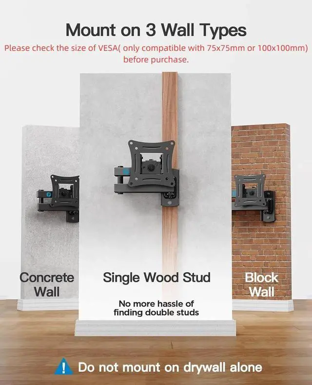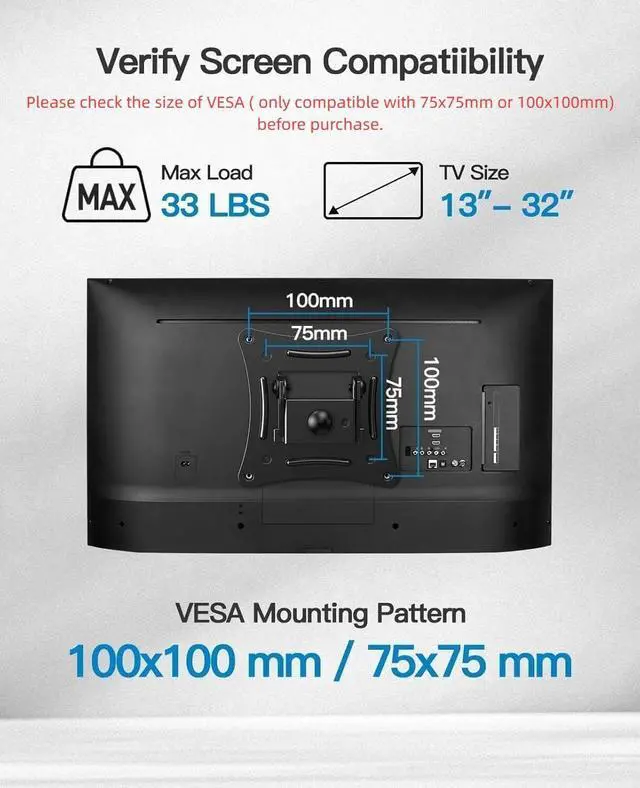 Min: 75x75mm) before purchase. Our wall mount tv bracket is beyond your imagination to ensure relax and leisure time. Robust Design for Optimal Support - The heavy-gauge line of tv mount features a sturdy design that ensures optimal support of your valuable TV at all times. Cast from high-grade material this swivel tv mount built in strong arms with solid and flexible joint to hold any TV weighting up to 33lbs.