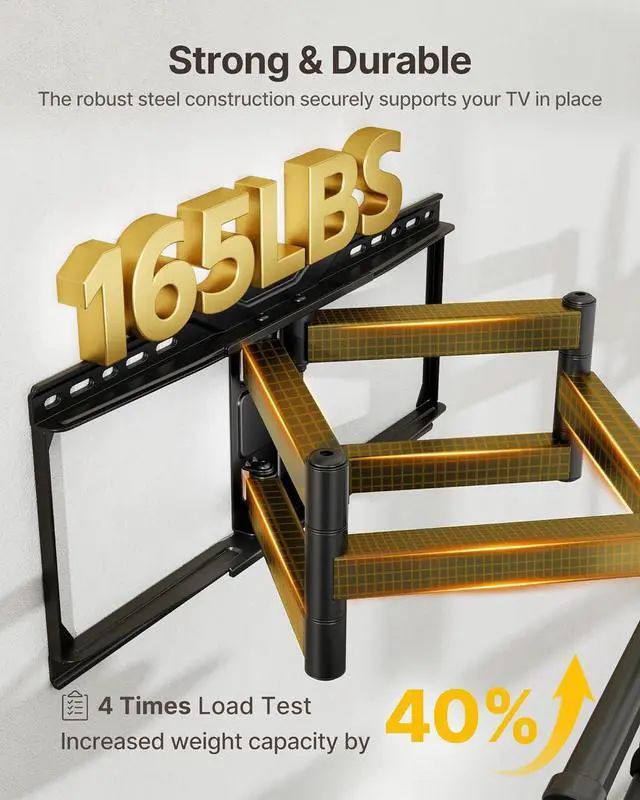 (Note: Not suitable for drywall alone. ) Its the ideal tv mount 100 inch choice for big screen upgradesULTIMATE FLEXIBILITY & VIEWING COMFORT Enjoy the best seat in any room with ±60° swivel ±3° leveling and +5° to -15° tool-free tilt. Effortlessly eliminate glare and find the perfect angle using our quick-tilt knob. Our 98 inch tv wall mount is perfect for movie nights watching sports or in a Zoom meeting. Make every seat the best seat with this adjustable tv wall mountEXTENDED ARM REACH & CLEAN LOOK The dual articulating arms extend up to 25.1 inchesoffering exceptional flexibility and a wider swivel range. Retracts back to just 2.75 from the wall for a low-profile modern look design that saves space while maintaining style. Our wall mount tv bracket includes Velcro straps to keep cables neatly tucked away and your setup clean and elegantQUICK INSTALLATION & PRO SUPPORT Installation is a breeze with pre-labeled hardware a bubble level and clear instructions so you can have your TV mounted in under 30 minutes. Plus our friendly customer support team is always ready to assist with any questions you may have. Reliable after-sales service means your satisfaction is our priority