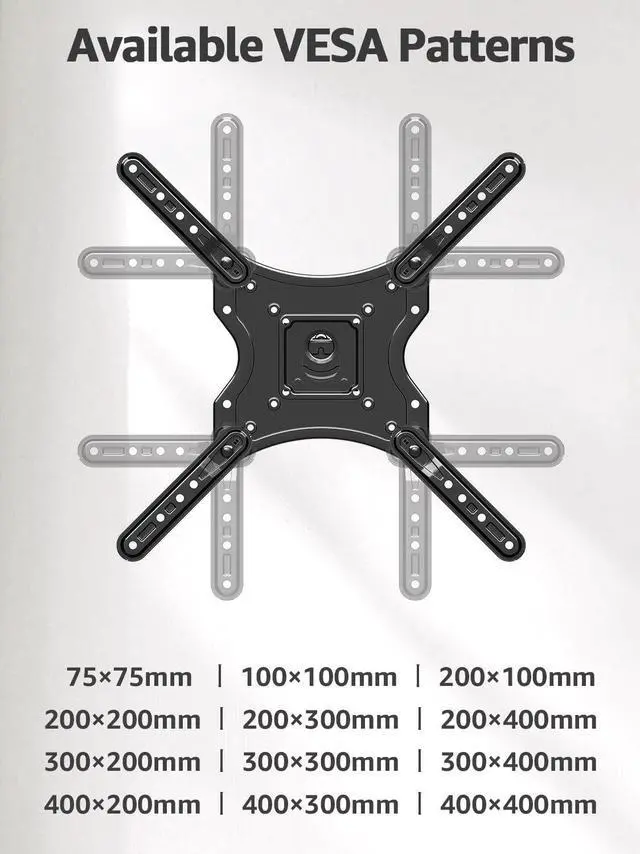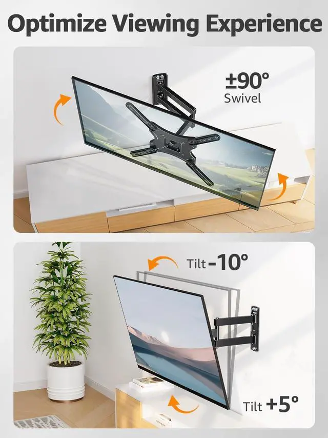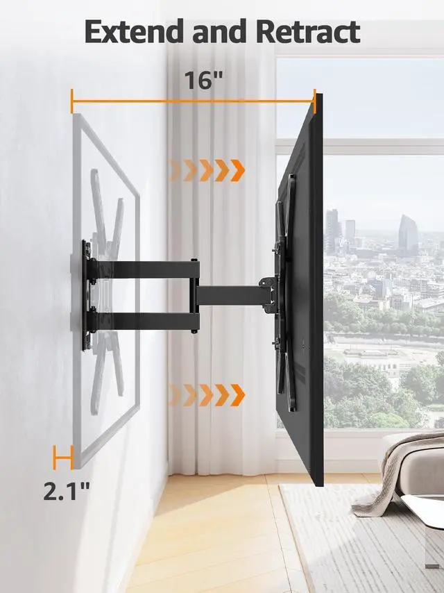 Universal TV Mount - This full motion TV mount fits most 26-60 inch TVs with vesa patterns range from 75x75mm (3x3) to 400x400mm (16x16) and holds up to 77 lbs. /35kg. Please Check TV weight size vesa and input access before purchase. Full Motion for Customized Viewing Angle - The articulating TV mount allows +/-90°swivel (max swivel angle depends on TV size) to provide full-motion adjustment capacity for ideal viewing. You can tilt angle ranging from +5°to -10°to reduce glare from lights and extends up 16 to get more comforts from any seat in the room and +/-5°level adjust for maximum viewing flexibility no more neck or back pain! Heavy Duty & Durable & Sturdy - The strong articulating 3-arm structure with cold-rolled steel ensures reliable strength and provides you sufficient swivel angle.
