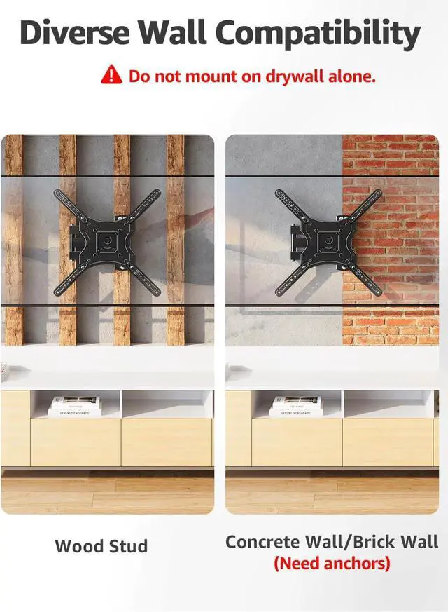 Note: Do Not install into drywall alone. Perfect for homes offices and commercial settings it fits widely in living rooms bedrooms home theaters conference rooms hotels and cafes our multi-functional TV wall mount offers tilt swivel & extension for ideal viewing. Space-saving sturdy & fits most TVs.