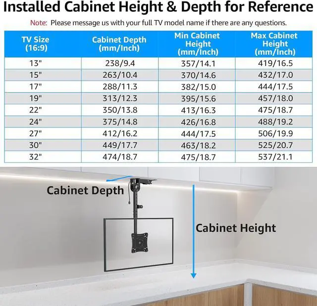 Compatibility: The under cabinet TV mount for the kitchen fits for most 13-32 flat screens up to 22 lbs (10 kg) with VESA patterns of 75 x 75 mm and 100 x100 mm. Please confirm your TV's weight size VESA pattern compatible wall types and make sure the installed cabinet space (height & depth) is suitable and ports remain accessible before purchase.