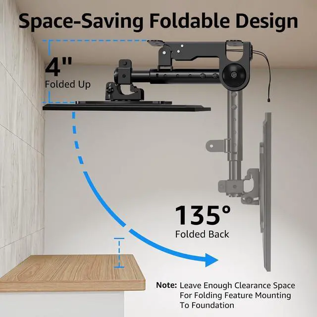 Space-Saving: This foldable under-counter TV mount offers the perfect solution for mounting TVs below cabinets. With a foldable locking design you can get more space after folding TV back when it is not in use. It's a great space saver!